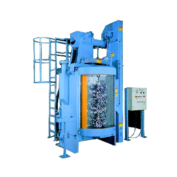 双工位吊钩转盘式抛丸清理机用于共建批量上下料时,不能翻转的敏感性工件,以及贴别复杂、重量轻的轴类等小件的表面清理及强化加工处理。将这些工件固定在一-个吊钩上,可进行一组抛丸时,另一组进行上、卸料。清理完成后转台翻转,依次重复动作。